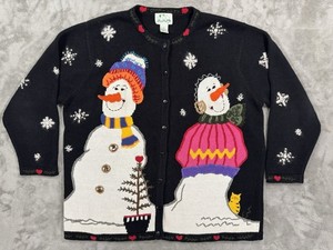 Quacker Factory Cardigan Sweater Womens L Black Christmas Grannycore Ramie