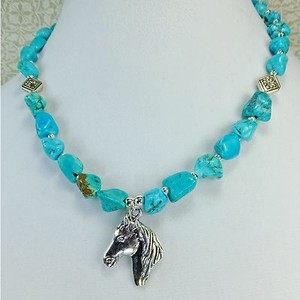 Small Mustang Horse Head Pendant Choker w/Dyed Magnasite Stone Nuggets Beads NEW