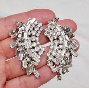 Asymmetric Vtg, paired Clip On Earrings silver tone, baguette crystals, Art Deco