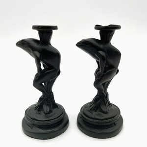 Pair of Vtg Bronze Frog Candlestick Candle Holder Art Deco Nouveau 4.5”