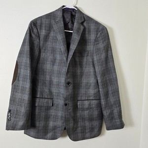 Tallia Suit Jacket Blazer Mens Medium Gray Plaid Elbow Patches