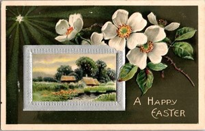 A Happy Easter 1910 Postcard Blossoms Country Landscape Scene Embossed Gilded