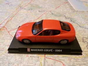 MASERATI Coupé 2004 orange IXO pour Auto Plus 1/43 sur socle avec défaut