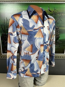 1970s Disco Mr. Jan Mens Geometric Pattern Polyester Long Sleeve Shirt Medium