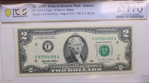 1995 $2., Federal Reserve Bank Note., PCGS CU-67 PPQ., GFRB070