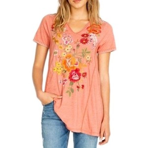 JOHNNY WAS Karlotta Top SIZE L Orange Embroidered Tunic V-neck T-shirt VGUC
