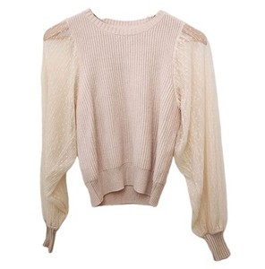 DECJUBA Beige Sheer Sleeve Rib Knit Top SIZE S Long Sleeve Blouse EUC