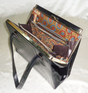 Vintage Black Vinyl Purse Hand Bag w Inner Paisley pattern, 4 Pockets~ 12x9x4 in