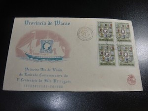 CHINA MACAU 1954 Sc#371 Portugal 1st Postage Stamp Blk/4 FDC, Nice Cachet