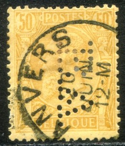 Belgio 1886 Effigie di Re Leopoldo I Unificato n. 50 usato - PERFIN (l825)