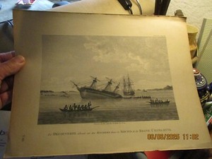Gravure Voilier 3 Mats La Découverte échoué dans le Sound de Reine Charlotte