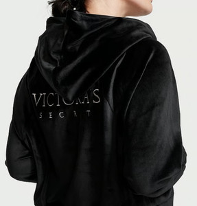 Victorias Secret Velour Zip Up Hoodie Jacket Size M Black Spell Out Y2K Bomber