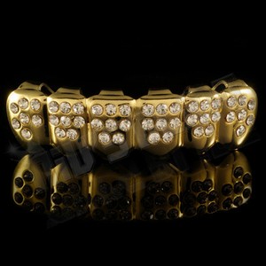 18K Gold Plated Top Bottom GRILLZ CZ Cluster Custom Slugs Mouth Teeth Grills Set