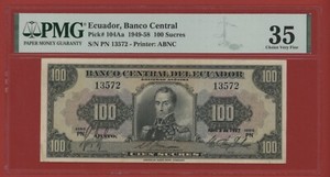 ECUADOR 100 SUCRES 1957 PN PICK # 104Aa PMG 35 CHOICE VEY FINE.