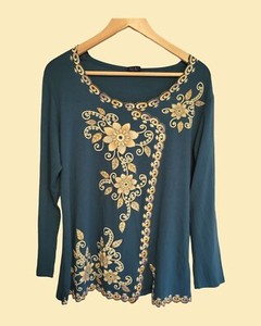 Women's Floral (Faux) Wrap Tunic Top Sz M Glitter Green-Blue TURKEY Unique