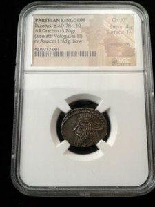 Parthian Kingdom Pacorus AD 78-120 NGC Ch XF AR Drachm Vologases Arsaces w/Bow