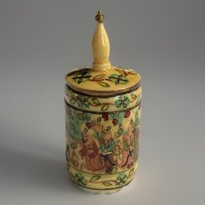 Unique Mughal Art Mini Trinket/Snuff Cylinder w/Lid Faux Bone? Hand Painted VNTG