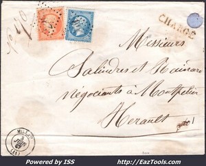 FRANCE N°22 + 23 SUR LETTRE CHARGÉE GC 2360 MILLAU AVEYRON + CAD DU 03/06/1867
