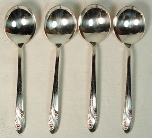 ROMANCE HOLMES & EDWARDS SILVERPLATE 4 ROUND SOUP SPOONS 1952