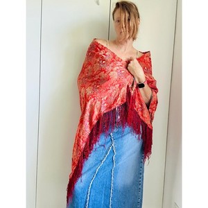 Vintage Asian Print Red Silk Wrap/Scarf With Fringe Ethnic Eccentric Accessories