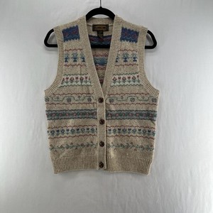Eddie Bauer Sweater Vest Womens M Wool Blend Knit Fair Isle V-Neck Vintage Beige