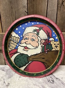 Vintage Santa Cookie Treat Candy Serving Tray Tin Santa & Sack Of Toys RARE FIND