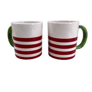 Holiday Christmas Lot of 2 Coffee Tea Cups Mugs Red White Stripe Green Handle