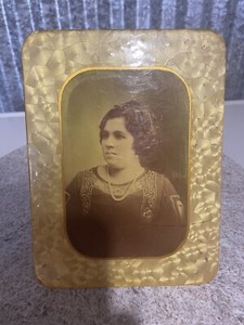 Vintage Alabaster Framed Portrait Photo on Tin Metal Frame w/ Stand Woman