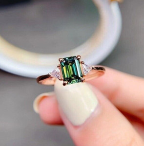 Green Emerald Cut Moissanite Three Stone Engagement Ring Beautiful Wedding Ring
