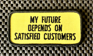 MY FUTURE DEPENDS ON SATISFIED CUSTOMERS EMBROIDERED SEW ON PATCH 4 1/4 x 2" NOS