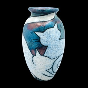 Vtg. Braemar Raku Pottery Vase Cats Design Vancouver Artisan Metallic Glaze 8”