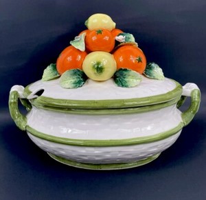 Rare Vintage Lemons and Oranges Majolica Basket Weave Soup Tureen