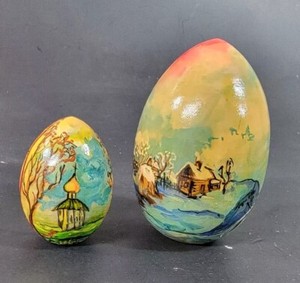 Vintage Hand Painted Colorful Decorative Wooden Egg Cabin Snow Church
