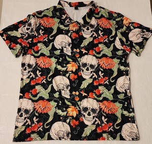 Skull & Floral Print Button-Up Shirt 3XL Polyester/Spandex Blend Short Sleeve