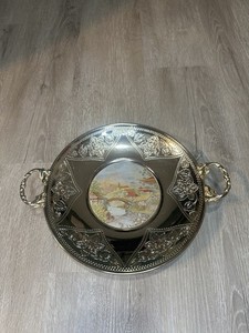 Vintage Silver Plated Serving Tray with Handles Ceramic Landscape Floral Border