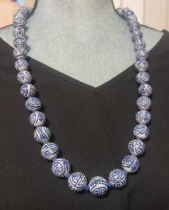 VTG CHINESE BLUE WHITE PORCELAIN BEAD Knotted NECKLACE Gold Tone Clasp 28”
