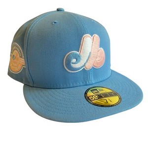 New Era MONTREAL EXPOS 59FIFTY Fitted Hat Cap SKY BLUE PINK UV Side Patch 7 5/8
