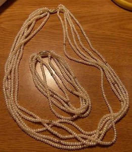 5 STRAND 18" WHITE SEED PEARL 10KT YG BEADS CLASP + MATCHING 7.5" 5 STRAND BRAC