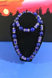 Antique Chinese Natural Lapis Laz Beads Enamel Necklace EarrIngs Set 青金石 Qing