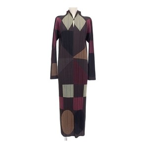 ISSEY MIYAKE PLEATSPLEASE High-neck long dress Women Brown multicolor 【A】