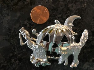 Halloween Jewelry Pin Brooch Silver Tone JOL Skeleton Cat Moon Pumpkin CUTE!