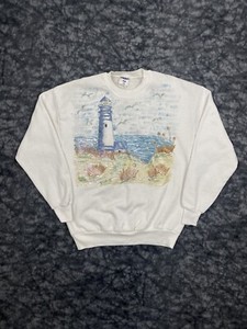 Vintage Handpainted Lighthouse Sweatshirt Mens Size XL White Nature Pullover 90s