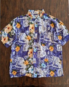 Vintage M.E. Sport Men's Shirt Large Purple Blue Hawaiian Print Camp Tropical