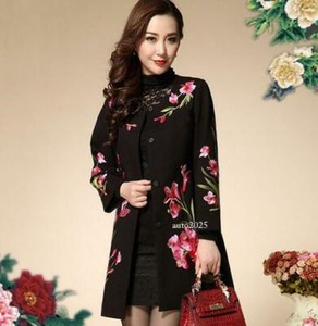Chinese Womens Floral Embroider Round Neck Coat Long Jackets Wool Blend Outwear