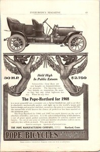 1908 Cadillac & 1908 Pope Hartford Automobile Print Ads from 1908 Everybody Mag