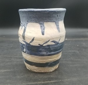 Studio Pottery VASE Ceramic Blue White Strip Birds SIGNED 6"