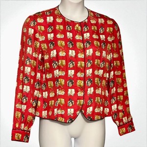 Vintage 90s Maggy London Silk Blouse Size 12 Red Gold Gift Print Holiday Glam